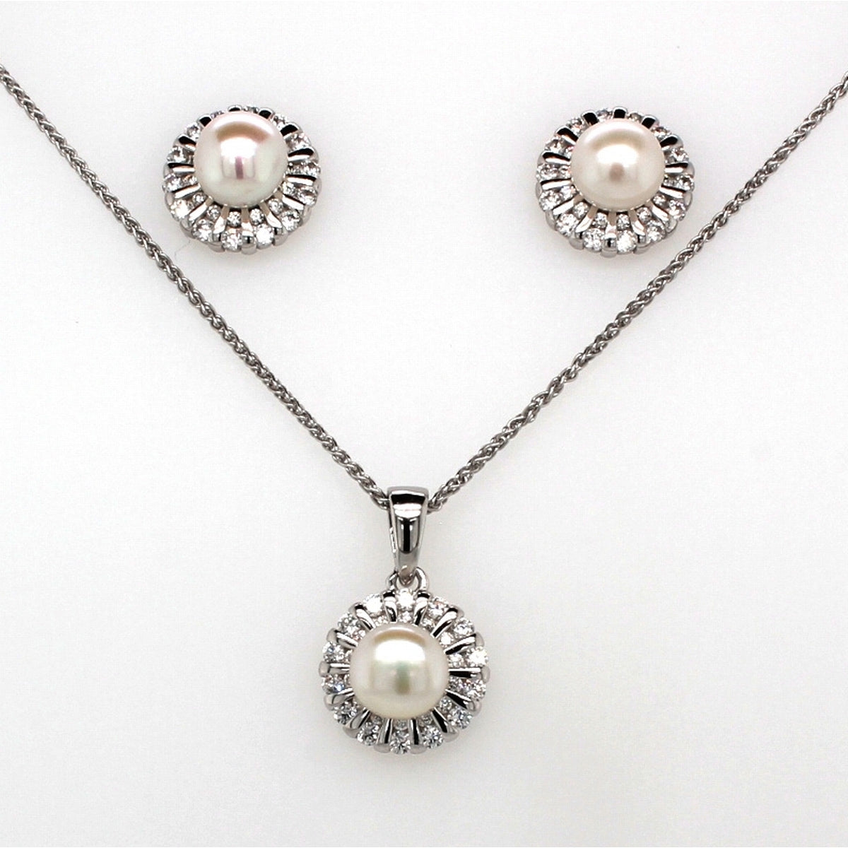 Silver Pearl And CZ Cluster Stud Earring And Pendant Set 6mm