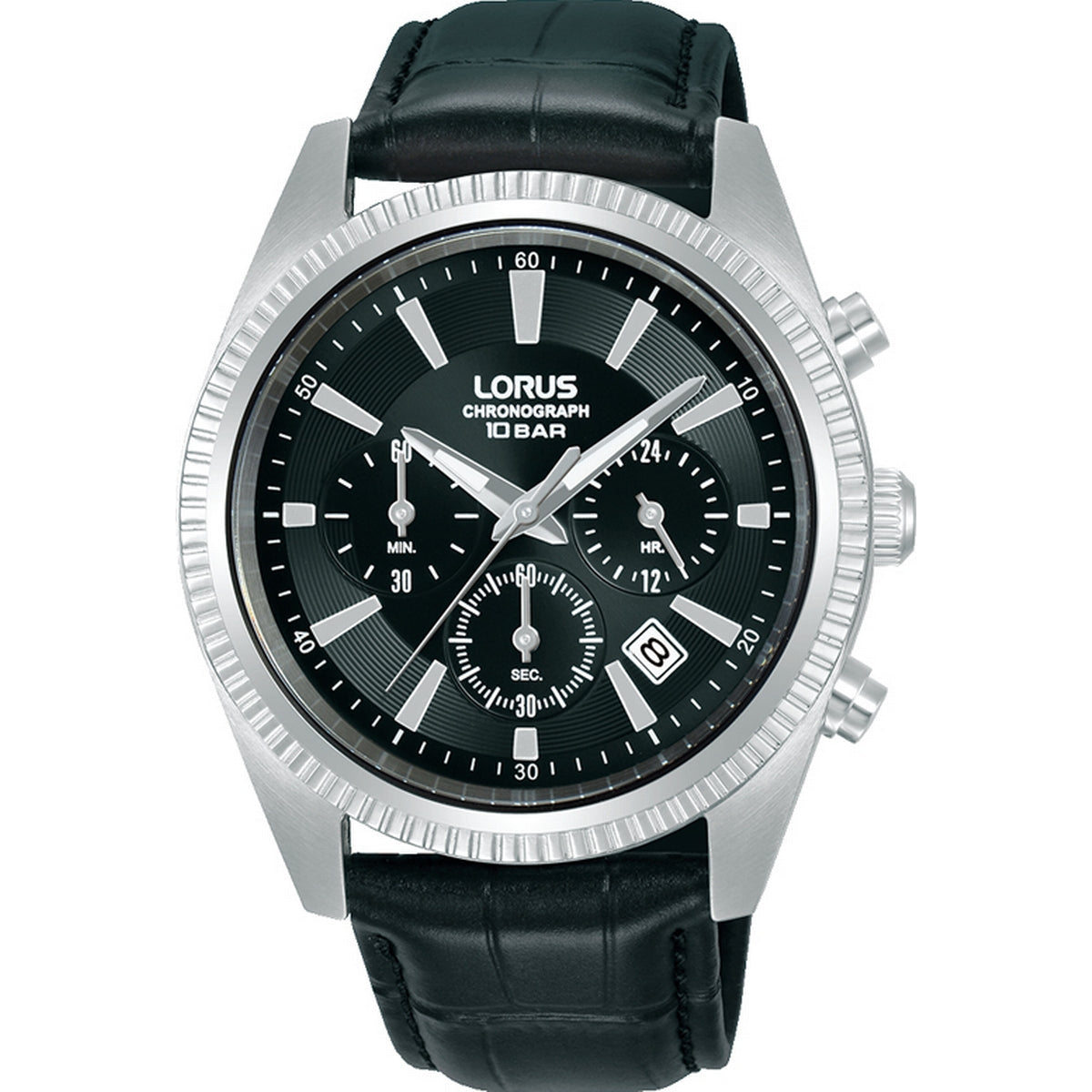 lorus quartz chronograph gents stainless steel black dial strap watch
