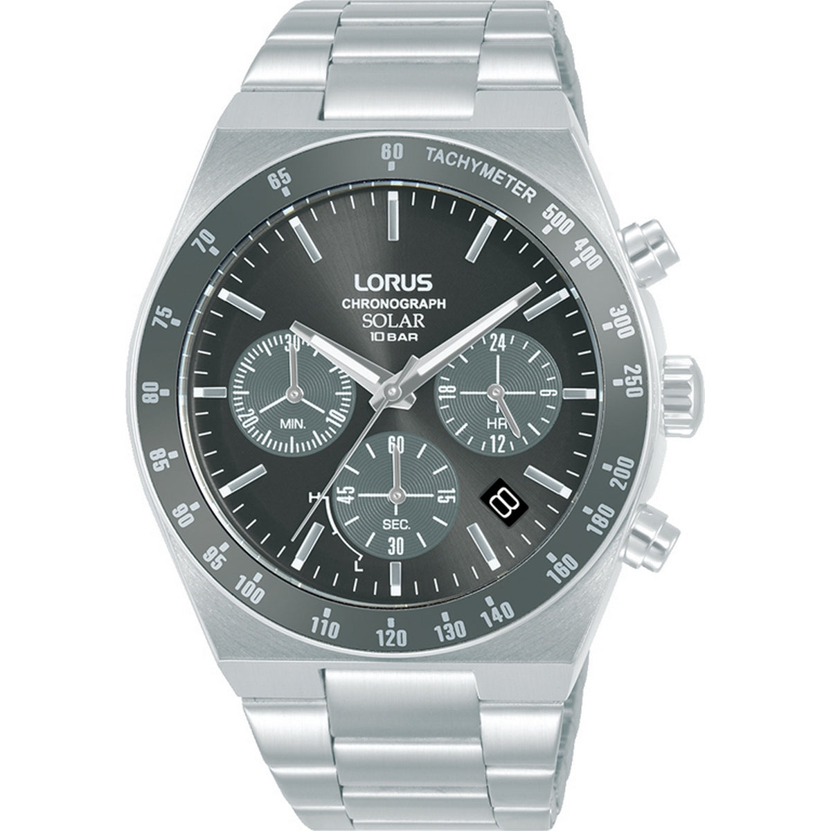 LORUS SOLAR CHRONOGRAPH GENTS STAINLESS STEEL BLACK DIAL BRACELET WATCH