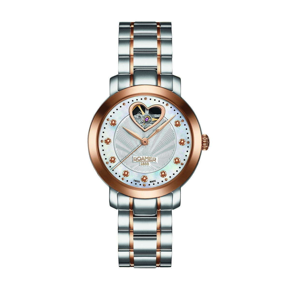 MOVEMENT TYPE: Mechanical MOVEMENT CALIBRE: BAND TYPE: Mixed Metal Bracelet CLASP TYPE: Deployment DIAL COLOUR: Mother of Pearl WATER RESISTANCE (Metres): 50 CASE WIDTH: 34mm CASE DEPTH: 8mm GLASS TYPE: Sapphire Crystal DATE FUNCTION: None STONE TYPE: