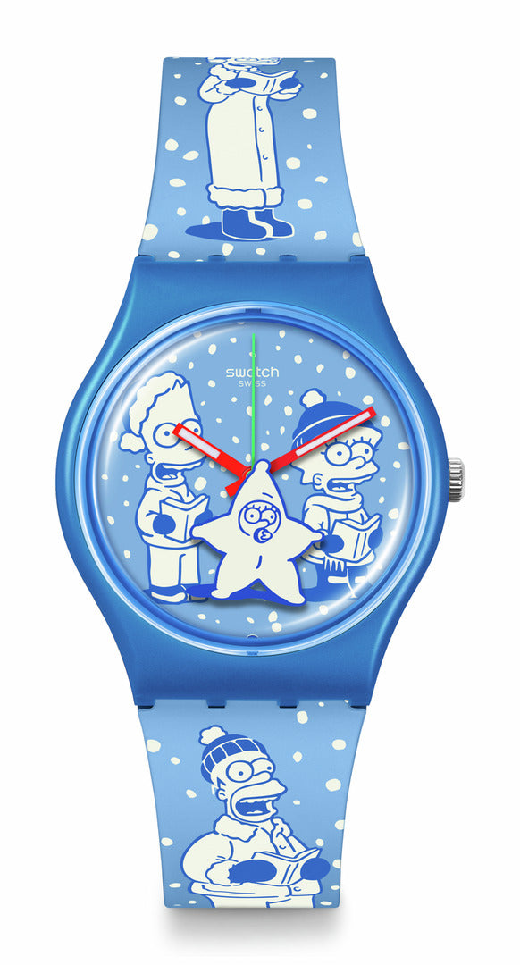 Regular price €95,00 Sale price €66,00 Save €29,00Part of the Simpsons collaboration collection, this blue Simpsons Holiday Special has a blue printed dial with red hands that glow in the dark and a biosourced case and glass. The scene on the watch is inspired by the very first episode of the beloved animated series. The glass features a white print of Maggie, the youngest member of The Simpsons family and the pale blue printed strap includes a contrasting dark blue loop and red buckle. TM & © 20th Television. Matt Groening
